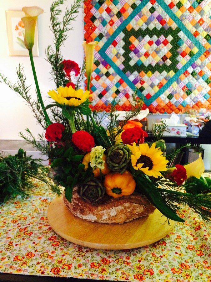 Elle a réalisé gracieusement un centre de table avec des roses et des citrons ainsi qu’un bouquet champêtre avec des fleurs et des légumes dans un socle en pain. Cette animation a été très appréciée par les patientes.