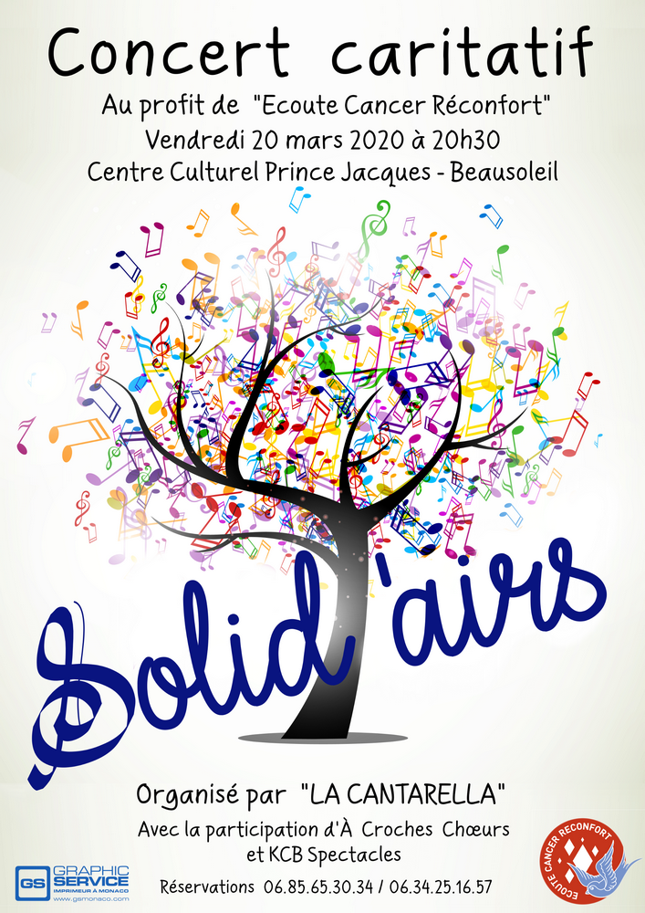 Concert caritatif organisé par La Cantarela au profit d’Ecoute Cancer Réconfort le vendredi 20 mars à 20h30 à Beausoleil , Centre Culturel Prince Jacques.