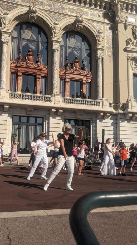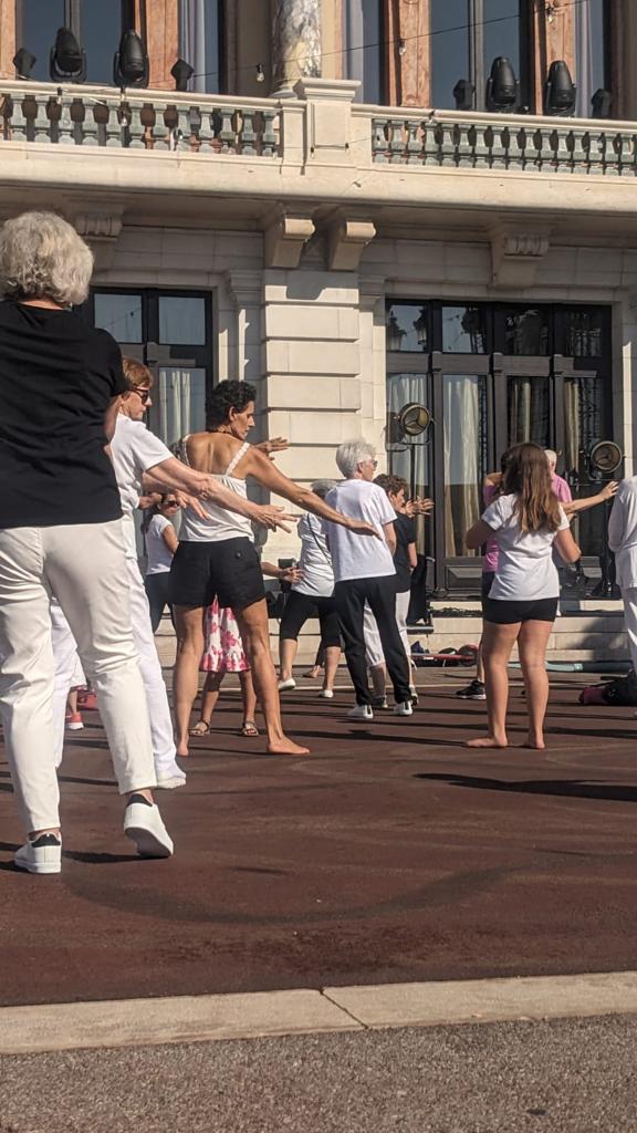 Lors de la fê(ai)te de la danse organisée sur la place du Casino les 8 et 9 juillet 2023, les patients d’Ecoute Cancer Réconfort ont exécuté des figures de tai chi avec leur professeur Françoise.